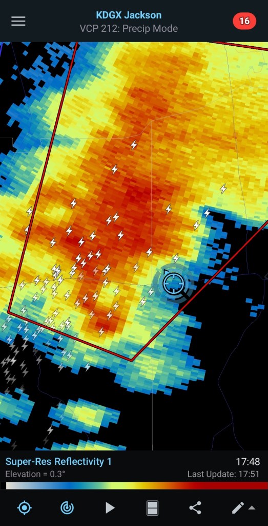 After search and rescue efforts had ceased, there were still more storms to gather data from. The Fisters team fueled our vehicles and headed east towards Monticello, MS to wait for another tornado warned supercell. As the storm got closer, we realized that we needed to move back west a few miles due to the storm track being more NNE rather than NE. FST-2 and FST Scout-1 began creeping west due to this tornado occurring after dark and the riad being lined with trees. Our safety is paramount in these chases.