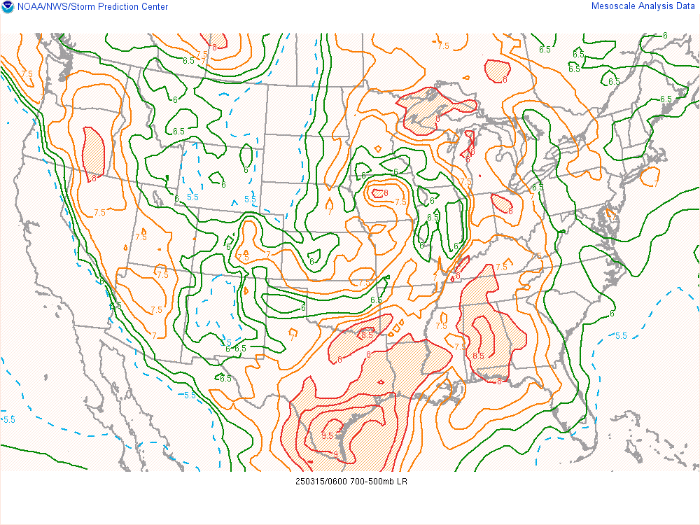 | Lapse Rates (°C/km) | 6-7 (Unstable) | Airmass was extremely unstable |